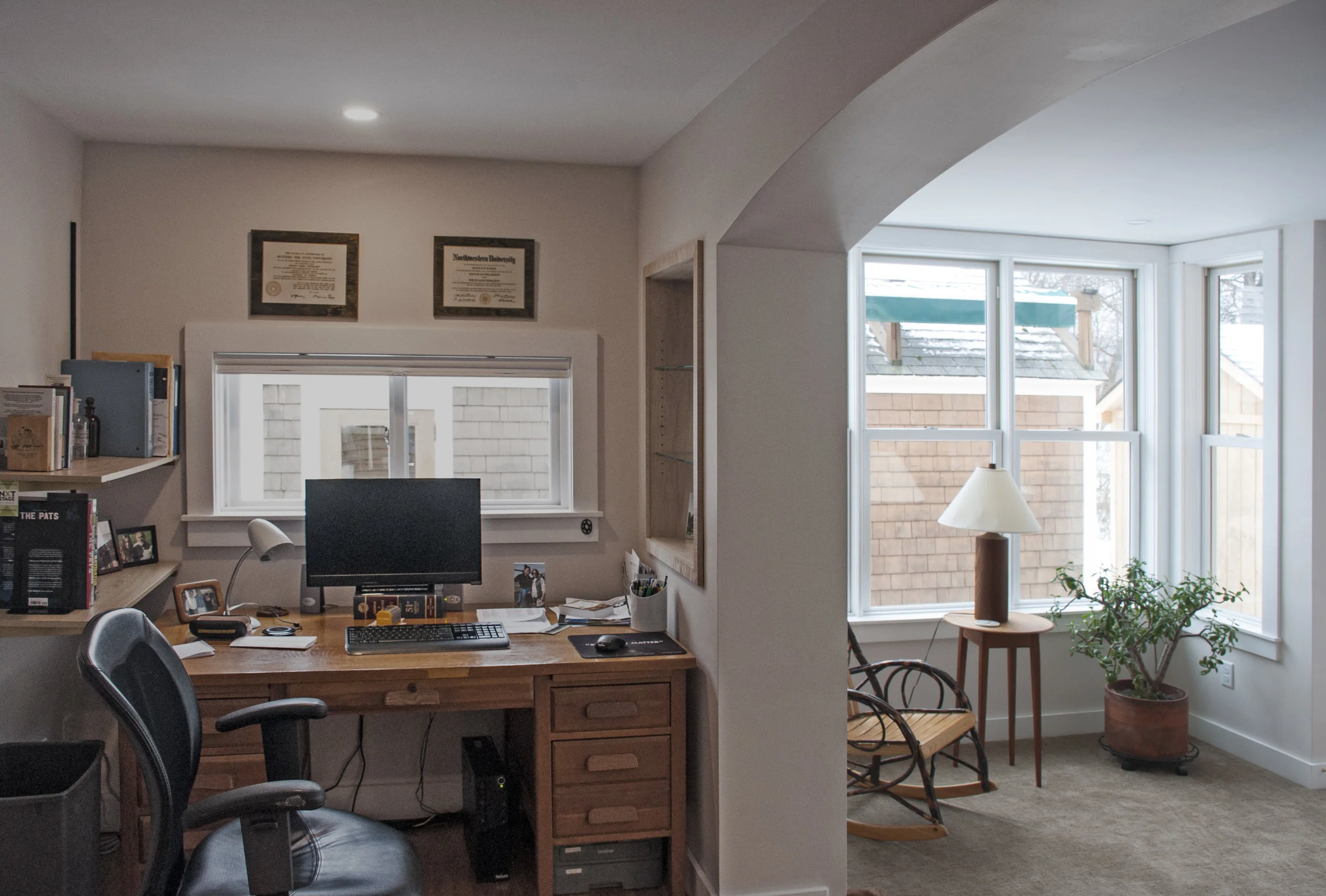 This house is one of many similar houses on a side street in Brattleboro, Vermont. The kitchen was dark and minimally functional. The living room was a funky later addition on the back of the house. We developed a long term plan and spent time looking at many options with much three dimensional modeling and imagery in order to feel confidant moving forward. In the end, structural modifications were minimal. We added a small entry mudroom and rebuilt the back living room and deck. Greg Goodman did the woodworking. Mindel and Morse were the General contractors for the early parts of the project and Moss Kahler did the later work.