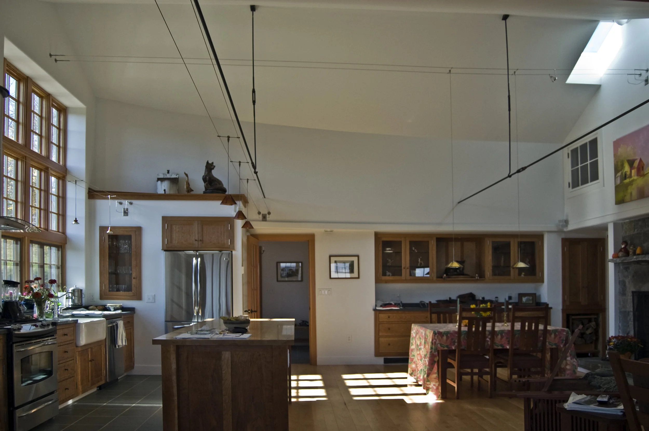 Renovation of a stone clad masonry building built in the late 50’s or early 60’s which most recently had been used as a private library and garage. This was a total gut remodel and addition into an energy efficient modern Vermont home